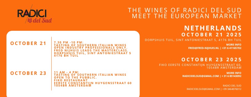 The seventh edition of the Southern Italian wines returns to the Netherlands on October 21st in Tuil and on October 23rd in Amsterdam.