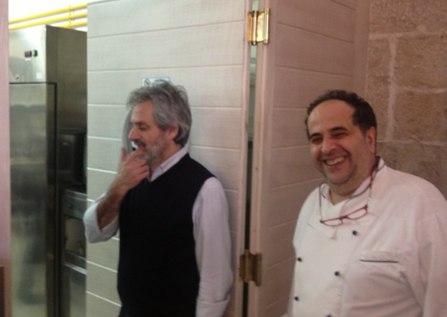 Il lavoro di Lello (a sinistra nella foto) è gioioso e stimolante, ascoltare il suo entusiasmo e il suo amore per la “terra in tavola” e il racconto dell’opera di proselitismo che da sempre lo vede protagonista nella divulgazione del concetto del km 0, riempie il cuore e ti predispone al meglio. E’ un piacere sentirlo parlare dei nuovi progetti che intende realizzare che ruotano intorno all’idea vincente della salvaguardia di attività agroalimentari che un tempo sembravano destinate a scomparire e che oggi invece rappresentano la condizione di partenza irrinunciabile per una ristorazione di grande livello e definita connotazione. Da sempre a Barletta ci sono contadini che nella primissima periferia del paese coltivano verdure di stagione dodici mesi l'anno e diverse varietà di frutta. Per non far morire questa tradizione Lello si fornisce da loro, i piatti in menù che esaltano la bontà dei loro prodotti sono numerosi e con smisurato impegno si dà da fare per incentivare la loro attività. Nella nuova sede il locale è tornato ad animarsi di vecchi e nuovi clienti che esprimono più soddisfazione che mai perché l'orchestra in questo locale suona una musica ancora più frizzante e vitale. Appena si varca l'ingresso del ristorante (privo di insegne che rimandino a qualsivoglia attività ristorativa, semplicemente “Antica Cucina dal 1983”), Lello spiega di preferire che alla sua attività non sia abbinata alcuna etichetta, l’idea che i clienti hanno del locale non deve essere per lui influenzata in alcun modo. Il rinnovamento si percepisce immediatamente attraverso i colori, la luce e le movenze del personale che al di là delle formalità esprime con fierezza il desiderio di accoglierti con calore in questa nuova dimensione. Il locale si distribuisce in due sale luminose, noi scegliamo la prima. Tutto da Lello è espressione di sobrietà, non ci sono stravaganze atte a stupire. Lello ha superato la fase nostalgica della stella Michelin, tra i primi in Puglia a meritarla, che dal 2002 non gli è stata più riconosciuta malgrado la sua arte culinaria non abbia avuto alcun sostanziale cedimento negli ultimi dieci anni.